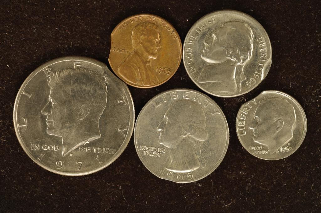 JEFFERSON NICKEL, 1965 LINCOLN CENT, 1968-D ROOSEVELT DIME, 1965 WASHINGTON QUARTER AND 1971-D KENNEDY HALF DOLLAR