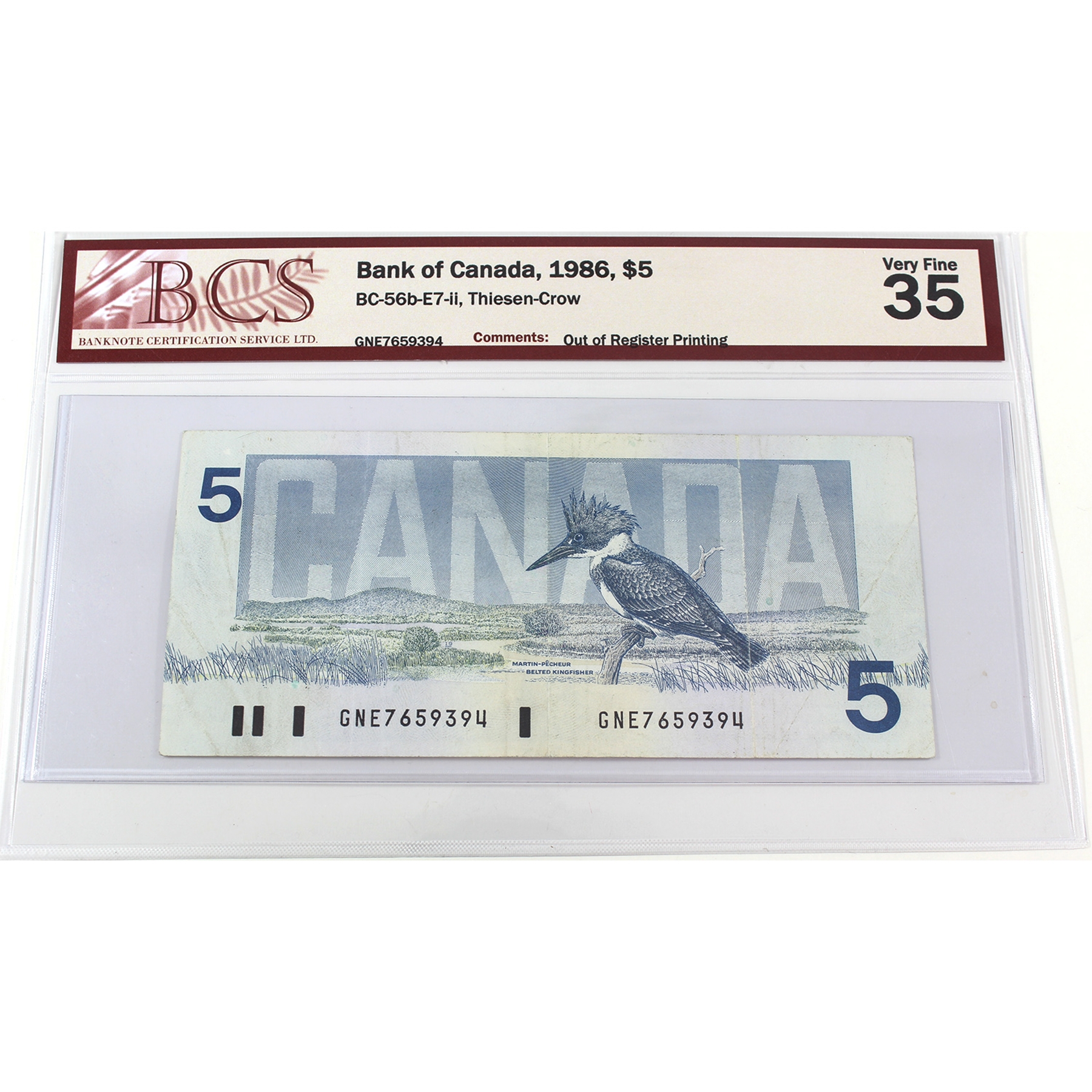 ERROR BC-56b-E7-ii 1986 $5 BCS VF35 Thiessen-Crow Out of Register Printing SN:GNE7659394