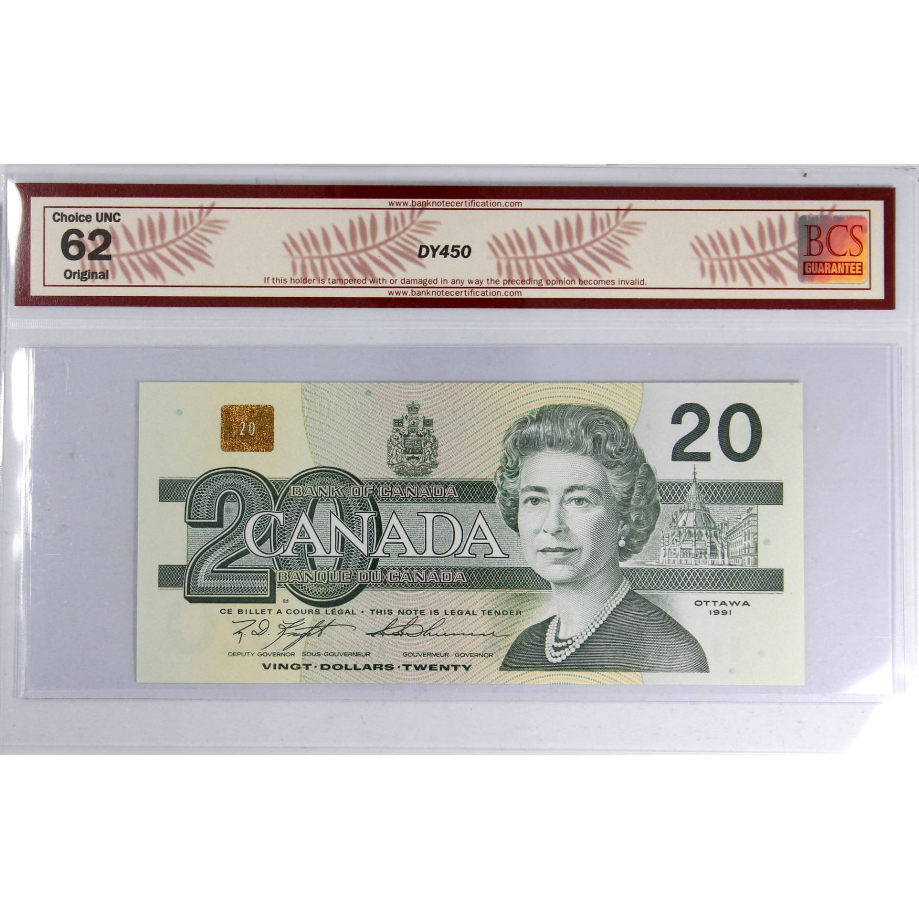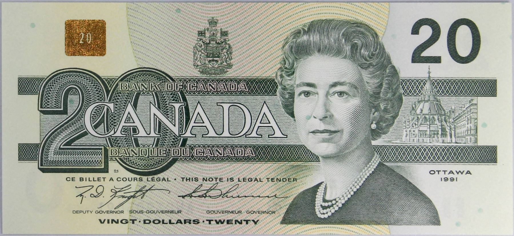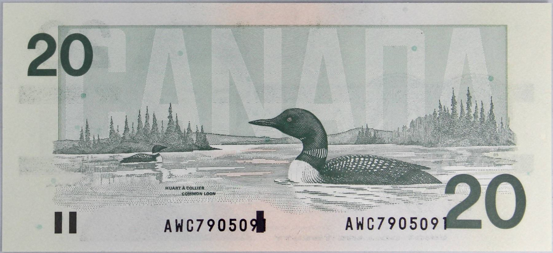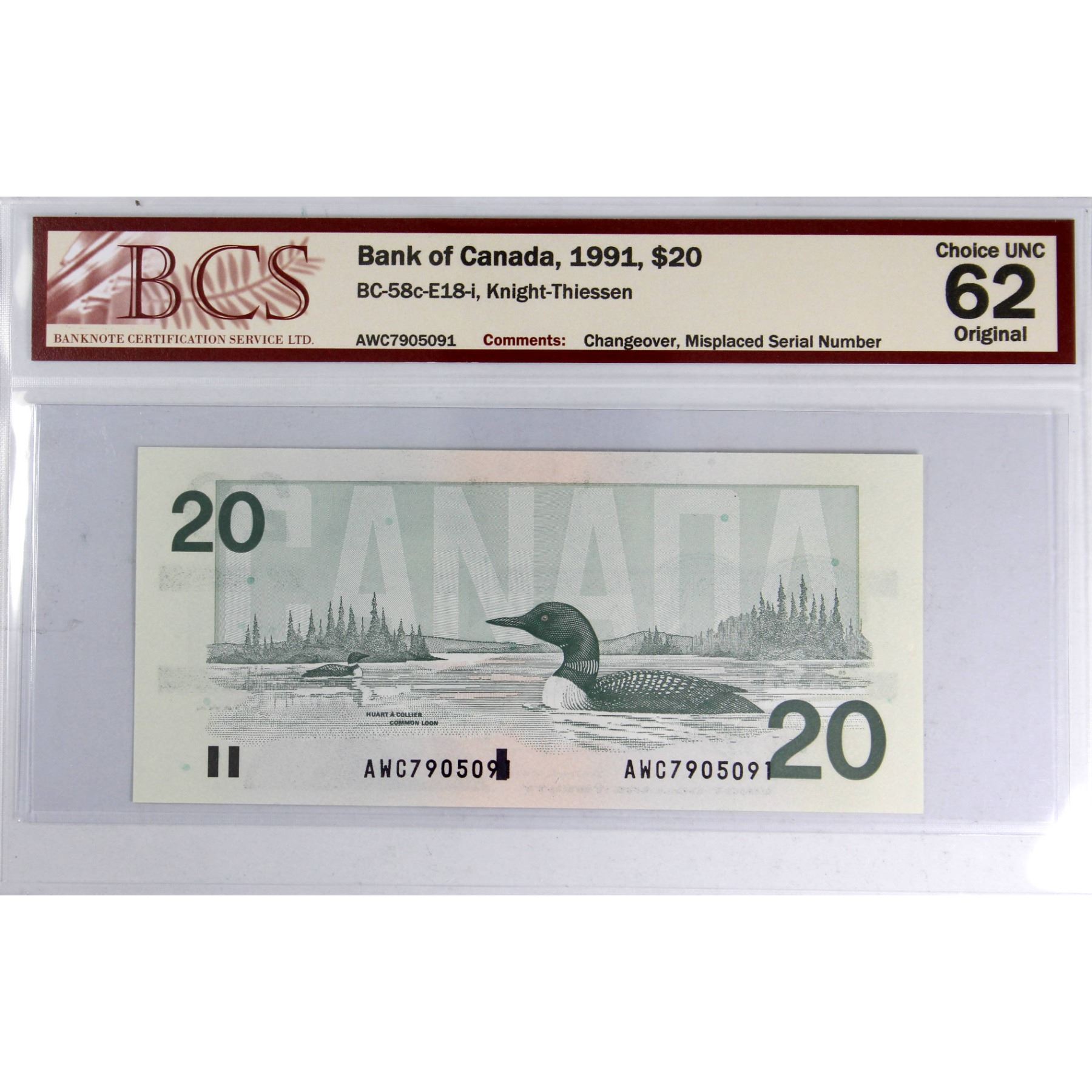 ERROR BC-58c-E18-i 1991 $20 'Misplaced Serial Number' BCS Choice UNC62 Original, Knight-Thiessen S/N: AWC7905091. Serial # Shifted to right last digit covered by black bar.