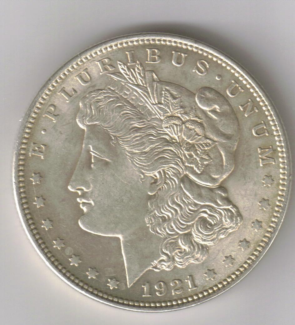 1921 MS++ MORGAN DOLLAR WITH MANY STRONG CRACKS AROUND AND THROUGH THE COIN, CLASHED FRONT AND BACK WITH DOUBLED DATE, STARS, EAR & LETTERING