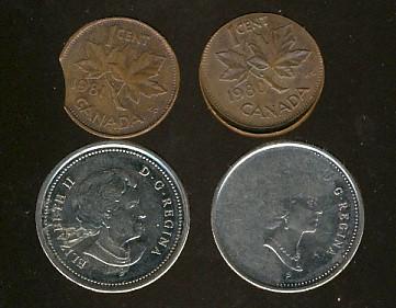 ERROR Coinage. Lot of 4 coins all with minor errors. Lot includes 1980 1¢ Thinned planchet with cap like strike, 1981 1¢ clipped, 1952-2002 25¢ with Die adjustment strike & 2003 25¢ Interesting planchet Flaw. Should be viewed.