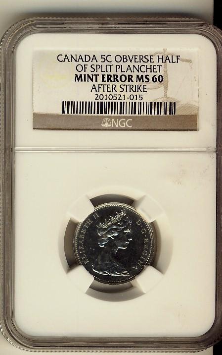 ERROR Elizabethan 5¢ NGC MS 60. Undated, obverse half of split planchet after strike.