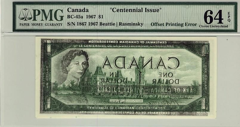 ERROR NOTE, 1967 $1 BC-45a 1867-1967 Offset Printing Error PMG UNC64EPQ