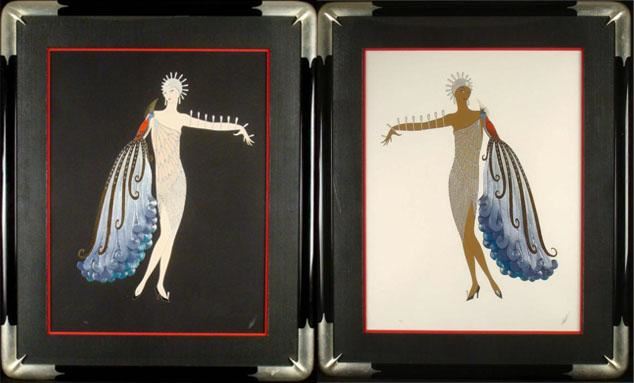 This pair of two Erté prints comprises the "Diva Suite." The black and white backgrounds create a beautiful contrast. The poses of the bodies and elegant plumage of the peacocks form a perfect balance of glamor and grace.Artist: ErtéSignature: In pencil on each, lower rightTitles: "Diva I", "Diva II"Medium: Serigraph on paper, with foil stamping Sheet size: 28 x 36 inches Year produced : 1984Edition: Each is numbered in pencil 264/300Framing: Double matted in silver threaded black fabric, and red inner border; black glossy wood frame with silver corners with hand-etched designs Frame size: 38 1/2 x 47 inchesCertificate of Authenticity: IncludedCondition: Excellent; minor damage to upper right corner of frame This is a stunning pair, worthy of any Erté admirer.The astonishingly creative, prolific and long-lived artist known to the world as Erté (Russia, 1892- 1990), literally defined chic in the last century. A brilliant fashion illustrator turned dynamic theatrical designer turned wildly successful graphic artist turned critically acclaimed sculptor, Erté's work is flamboyant, sensual, witty, fantastic and highly collectible.