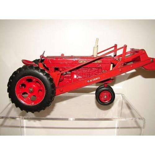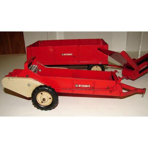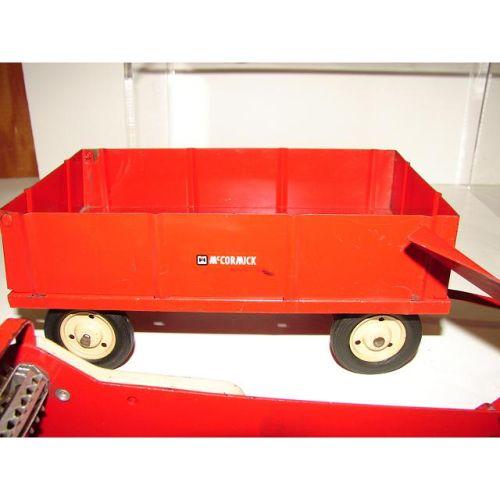 ERTL 4 PIECE INTERNATIONAL FARM TOY SET. Consists of a Farmall 560 narrow-front tractor with McCormick front-end loader (13.25” L), McCormick elevator (18” L), McCormick wagon (10.5” L), and McCormick manure spreader (10.5” L). Tractor and spreader show some loss to paint. From the Coleman Wheatley collection.