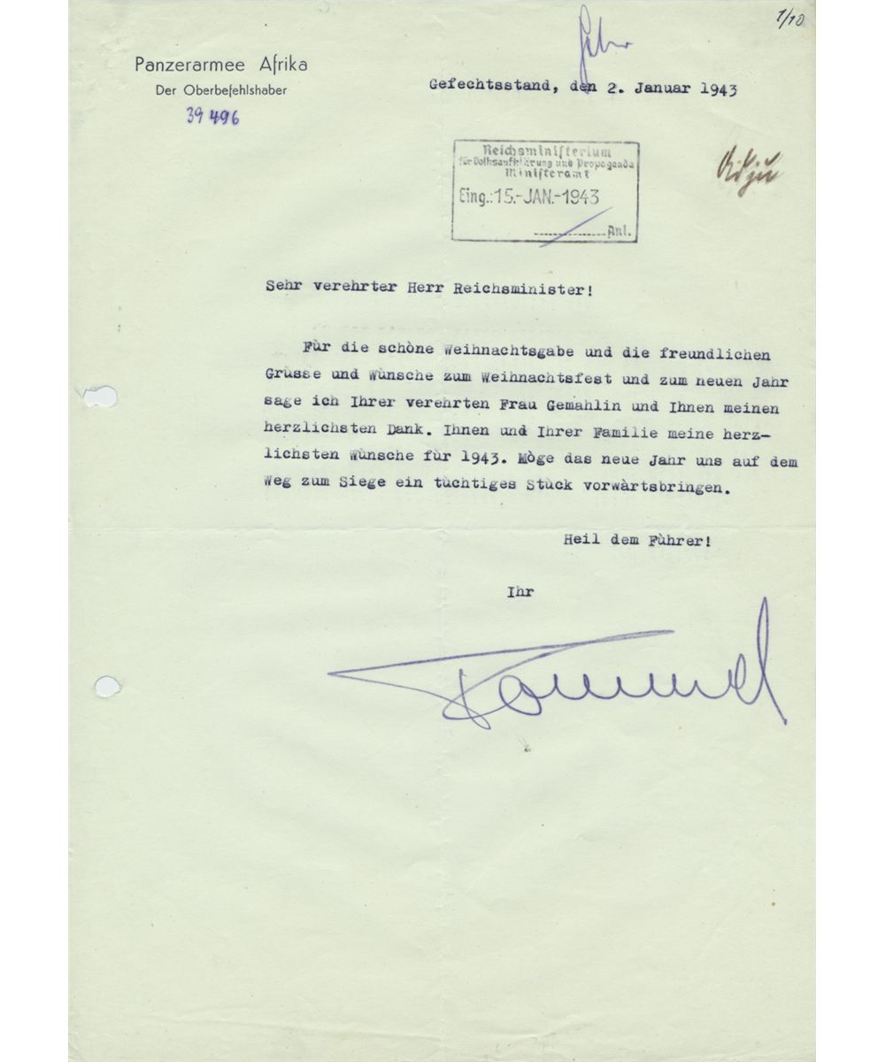 (1891 - 1944) German field marshal whose Afrika Corps threw back repeated British and American assaults in North Africa, later he defended Normandy and ultimately was forced to commit suicide due to his implication in the Hitler bomb plot. Fine association war-date T.L.S. on his Der Oberfehlshaber Panzerarmee Afrika" letterhead, 1p. 4to., "In the field", Jan. 2, 1943 to Minister of Propaganda Joseph Goebbels. Rommel warmly thanks Goebbels for his Christmas greetings, presents and New Years sentiments, extends his own best wishes, and concludes: "...hoping that the new year will bring us forward to great victory...". Boldly signed in indelible pencil. File holes at left, else fine condition. After defeat at El Alamein and a skillful withdrawal to Tunesia the previous Fall, Rommel would soon inflict a sharp defeat on the American forces at the Kasserine Pass, in February.
