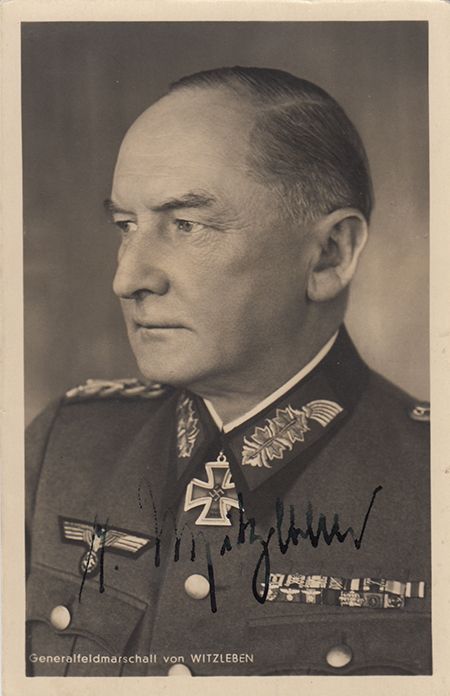 (1881 - 1944) German general whose forces broke the Maginot Line forcing the surrender of three French division. Involved in the July 20 plot on Hitler's life, he arrived at OKH headquarters to assume command of the coup forces and was immediately arrested. His execution was filmed for Hitler's enjoyment. S.P. 3 1/2" x 5 1/2" b/w, a chest, up pose in uniform by Hoffman, boldly signed across the face. Fine.