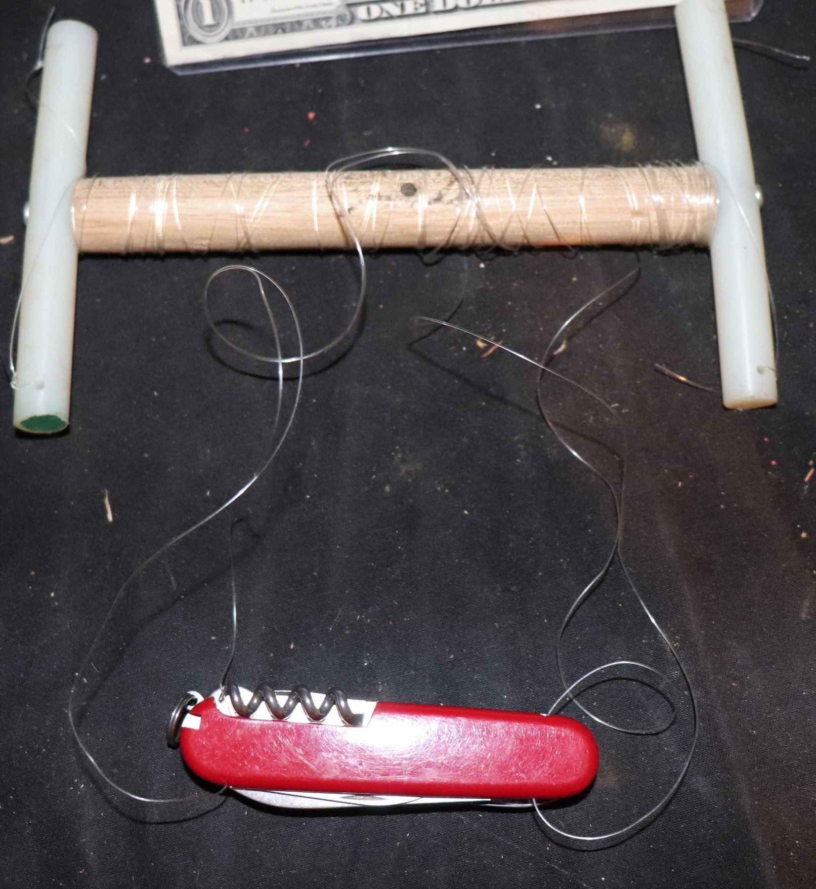 Has fishing line attached to puppetry rig.