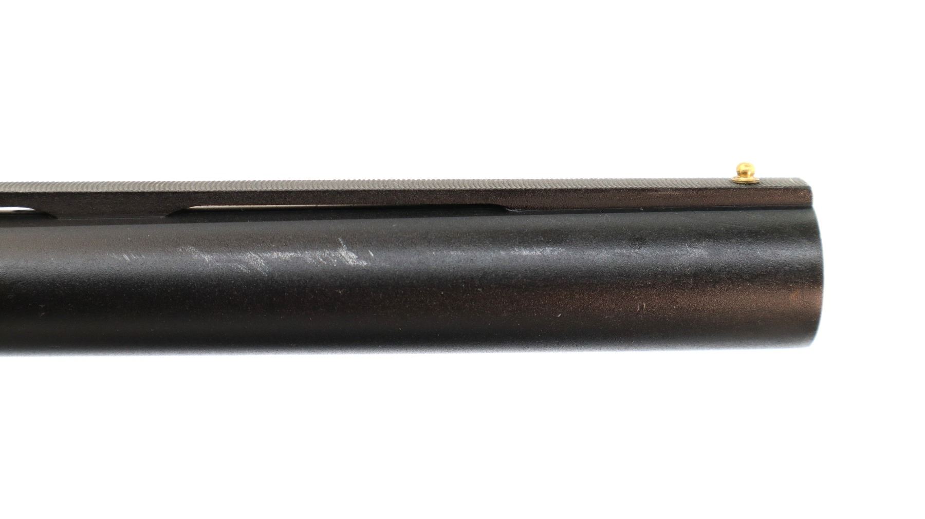 Main Description: Brass bead, black matte vent rib barrel bulged on the left side, grooved black alloy receiver, action does not cock fully requires adjustment parts or repair. Two piece wood stocks, finger grooved checkered forearm and pistol grip, brown rubber recoil pad, sling swivels.