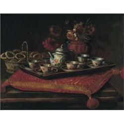 ESCUELA NAPOLITANA, PRIMER TERCIO S. XVIII. "Bodegón : Servicio de té de porcelana de Compañia de Indias estilo Imari en una bandeja sobre un cojín de brocado con cesta de rosquillas y jarrón de cerámica de Tonalá con flores encima de una mesa". Óleo/lienzo . 60 x 74,5 cms. Anteriormente atribuido a Juan Bautista Romero.