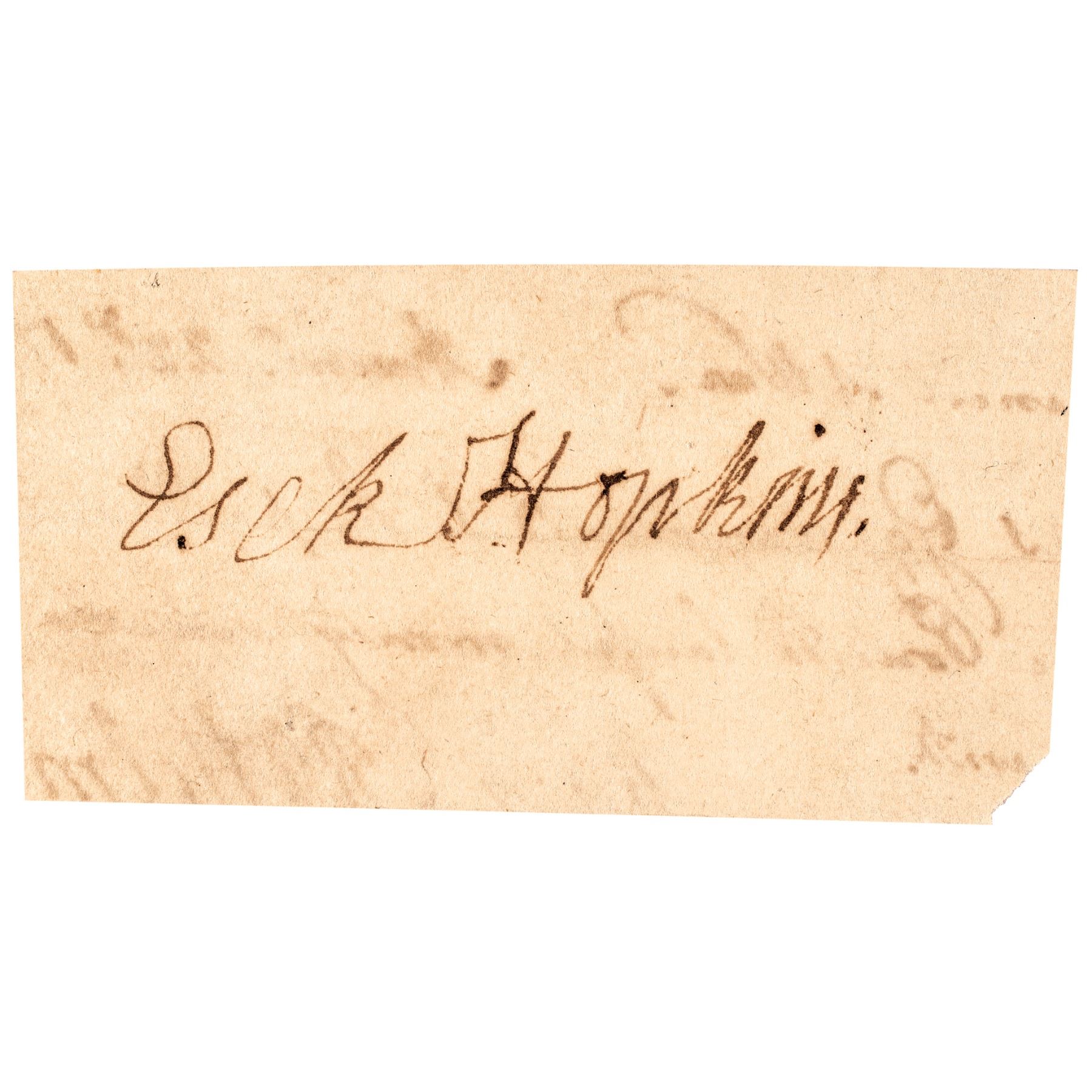 Clipped Signature “Esek Hopkins”, measuring 3” x 1.75”, framed together with a oval portrait image to fully 5.75” x 7.75”, viewed through special UV Plexiglas, Very Fine. On December 22, 1775, Esek Hopkins was appointed Commander in Chief of the Continental Navy authorized by the Continental Congress to protect American commerce. Hopkins took command of eight small merchant ships that had been altered as men-of-war at Philadelphia. After much deliberation about taking on the overwhelming British forces listed in his orders, Hopkins utilized the last portion of his orders. He sailed south on February 17, 1776, for the first U.S. fleet operation that took the fleet to Providence in the Bahamas. He felt that it would be much more advantageous to seize a prize for the Continental Army than take a chance of destroying the Continental Navy in its infancy. He knew that the British port in Nassau would be poorly guarded and had friends there who would help his cause. A scarce early American Naval signature.