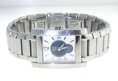 ESQ Stainless Steel Watch.The total watch's weight is 64.6 grams.The measurements of watch head is 22 x 19 mm and 5 mm thick.The length of watch: 6".swiss made.water resistant.Chain is 14 mm wide