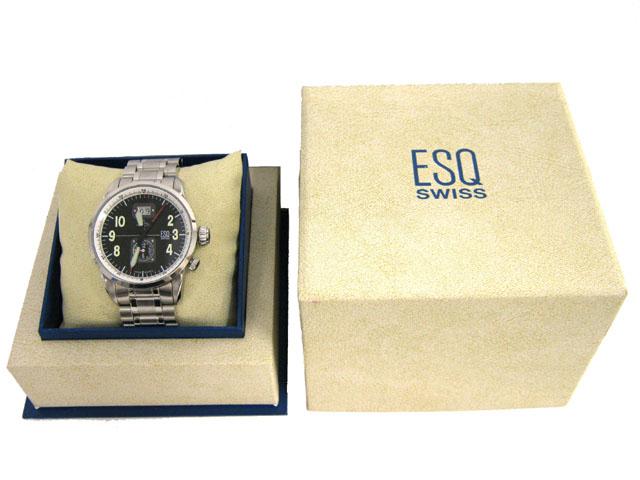 This is an ESQ Swiss Beacon Men's 07301129 Watch with the following features: Stainless Steel Case and Bracelet; Black Dial; Scratch Resistant Sapphire Crystal; Luminescent Hands and Hour Markers; Date Display Below 12:00 O'Clock; Fold Over Deployment Clasp; Dual time subdial; Case Diameter 42 Millimeters; Case Thickness 12 Millimeters; Swiss Quartz Movement; and Water resistant to 30 Meters (100 Feet