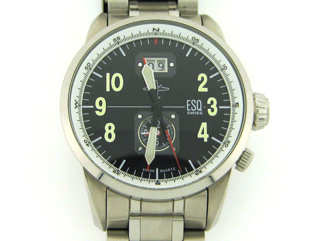 This is an ESQ Swiss Beacon Men's 07301129 Watch with the following features: Stainless Steel Case and Bracelet; Black Dial; Scratch Resistant Sapphire Crystal; Luminescent Hands and Hour Markers; Date Display Below 12:00 O'Clock; Fold Over Deployment Clasp; Dual time subdial; Case Diameter 42 Millimeters; Case Thickness 12 Millimeters; Swiss Quartz Movement; and Water resistant to 30 Meters (100 Feet