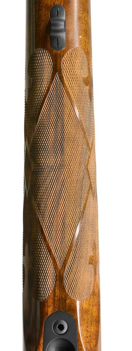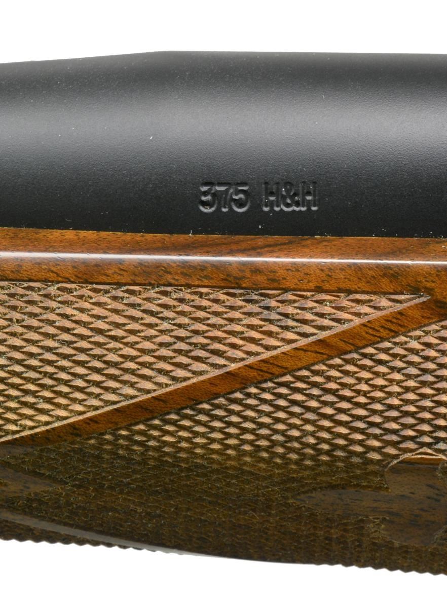 RIFLE COMPANY “AFRICAN” WITH TRAVEL CASE AND OTHER ACCESSORIES. Cal. 375 H&H. S# 687470. Bbl. 24" lightweight fitted with ERA rear sight block holding elevation adjustable express rear sight and front ramp with white bead. Caliber is marked at left rear. Sako 85 action fitted with QD scope mounts and has safety at right side of bolt shroud. Bottom metal holds removable magazine. All metal parts are black coated. Pistol grip stock of exhibition quality, wonderfully marbled and figured Turkish walnut, laminated (for stability) measures 13 7/8" over black Decelerator pad and features American comb, swept right hand cheekpiece, palm swell, skeletonized ebony grip cap, ebony forend tip, recoil pins, and fancy pattern fleur-di-lis checkering with panels separated by ribbons at grip and around forend. WEIGHT: 8 lbs. 2 oz. UNATTACHED ACCESSORIES: tan ABS Pelican 1750 case with green Kilimanjaro stencil on top is foam lined, and contains zippered rifle case embroidered with Kilimanjaro logo, Cobra type Kilimanjaro leather sling, jacket patch, and a black pouch containing muzzle brake which attaches with removal of ring at muzzle, QD scope rings and a drift pin. Rifle was donated to “SCI” silent auction and pertinent information is also in case. Photograph of this rifle and with test target with clover leaf group at unspecified distance with loading data. CONDITION: appears unfired since proof with only a few scattered handling and assembly marks in all surfaces. Mechanically crisp. Case is new. This model Kilimanjaro rifle “always custom made” retails at over $17,000.00. (20-617/MGM87). MODERN. $8,000-12,000.