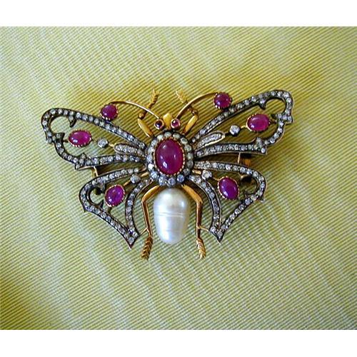 TOTALLY SPECTACULAR ~ 18K, RUBY, DIAMOND & PEARL BUTTERFLY PIN / The pin set with 164 round diamonds, 9 rubies and a large pearl 12.7 x 7.9 MM / This is simply a great pin for the "bug" collector. BURTON BROOK FARM ANTIQUES for fine estate.