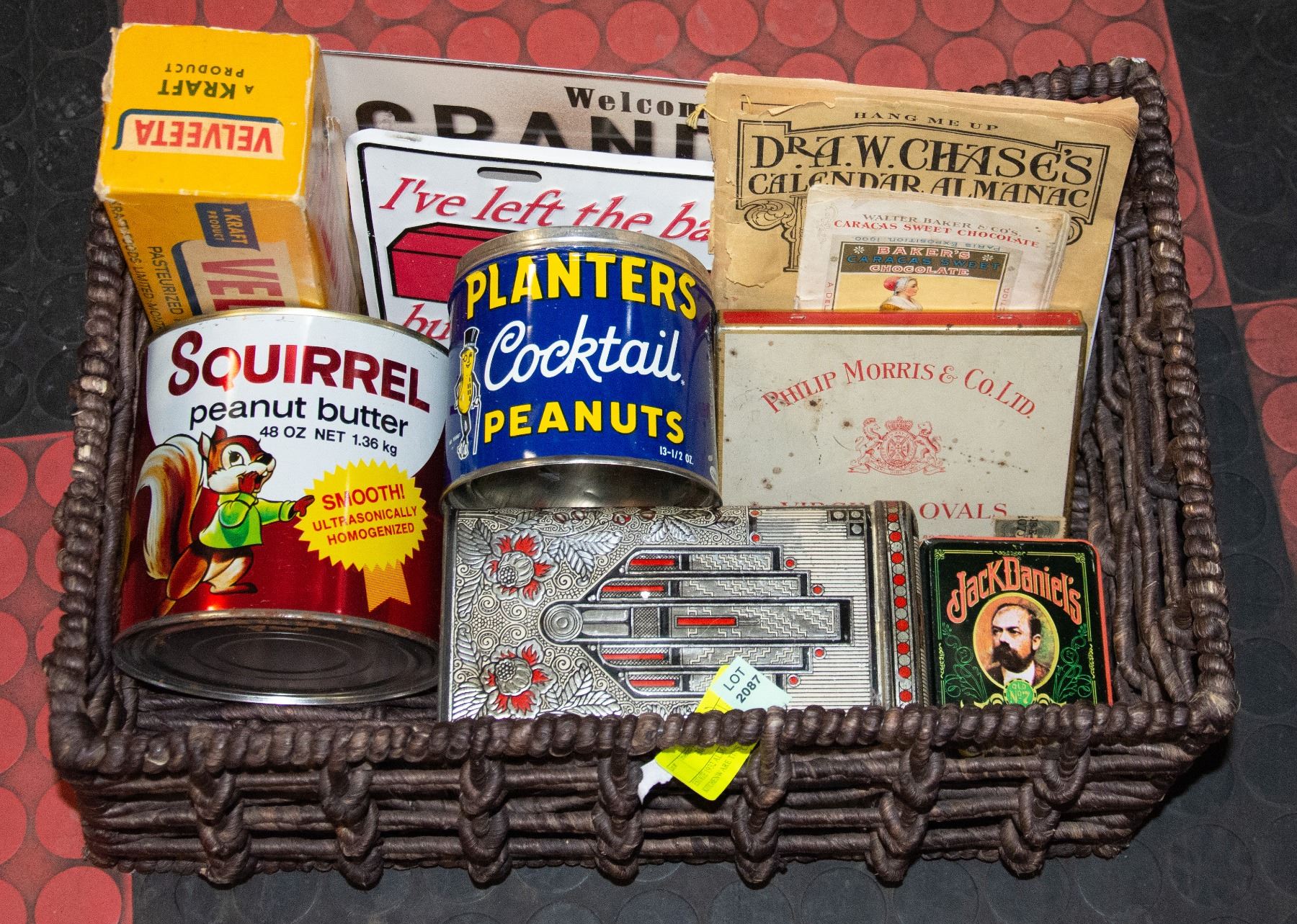 ESTATE 1932 ALMANAC, VIN KITCHENWARE TINS &
