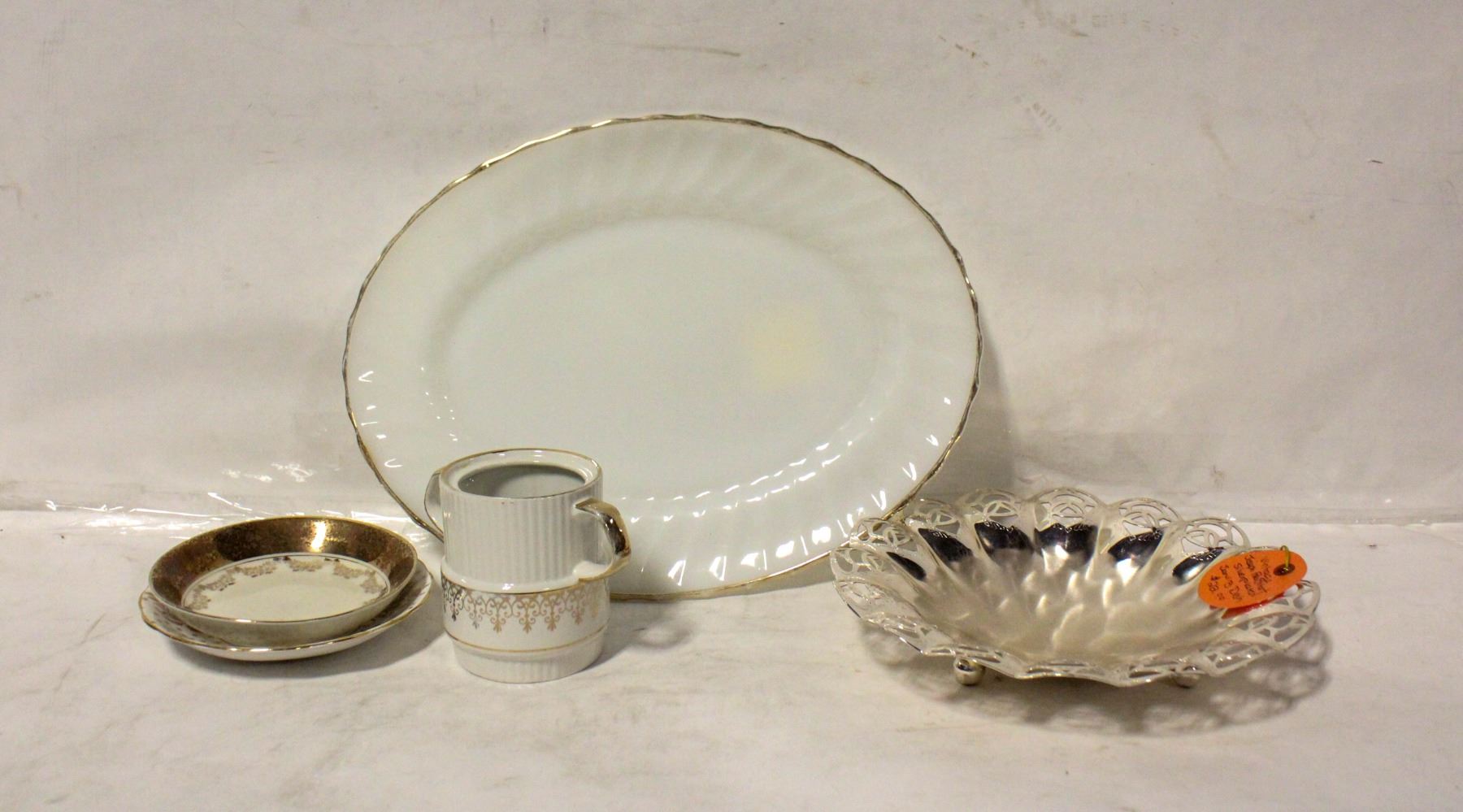 TRAY SOLD WITH SILVER PLATED SERVING DISH AND MATCHING CHINA CUP WITH 2 PLATES