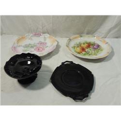 TWO HAND PAINTED LIMOGE OR GERMAN PLATES, AND TWO NICE PIECES OF BLACK AMETHYST GLASS, BOWL AND PLATE. ALL FOR ONE MONEY.