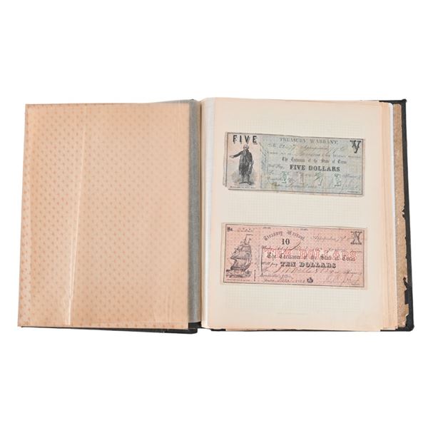 Large collection of currency and tax receipts in Postage Stamp Album from Scott Stamp & Coin Co. New York.