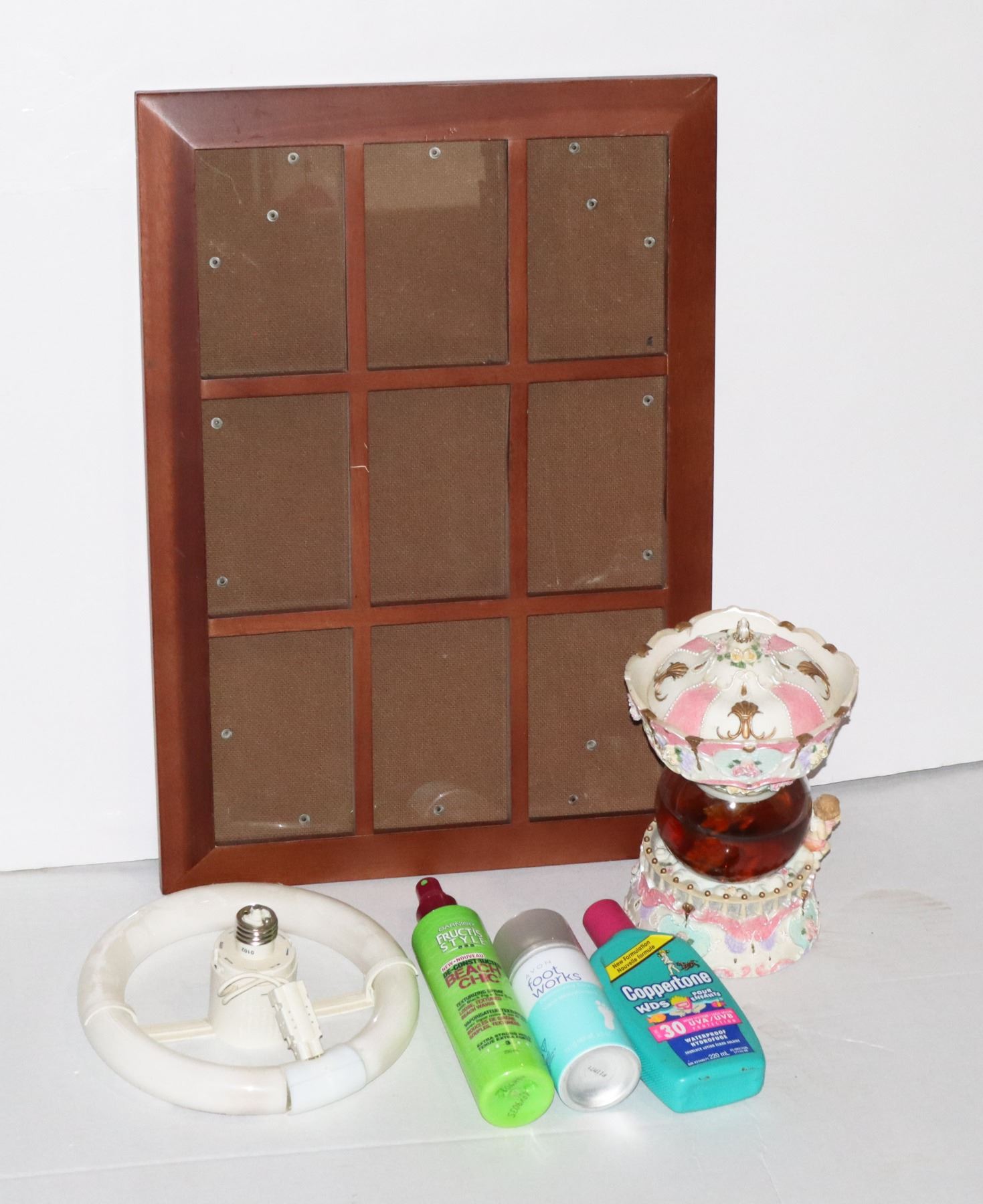 LIGHT BULB, SNOW GLOBE (NEEDS WATER CHANGED, NOT SURE IF EASY TO DO). NOT NEW BEAUTY PRODUCTS (USE AT OWN RISK)