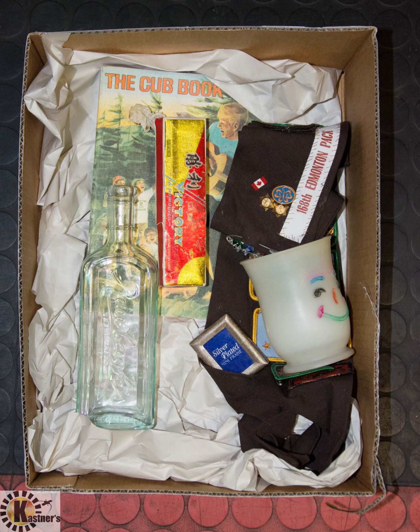 INCL. "THE CUB BOOK" AND SASH FULL OF SCOUT BADGES, VINTAGE "VICTORY"-HARMONICA IN ORIGINAL BOX, VINTAGE BOTTLE, ETC.**ALL ITEMS MUST BE REMOVED BY 5PM MONDAY, OCTOBER 10TH, 2022. ALL REMAINING ITEMS WILL BE SUBJECT TO A $6.00 PER DAY STORAGE CHARGE. ANY ITEMS REMAINING AFTER MONDAY, OCTOBER 24TH, 2022 WILL BE CONSIDERED FORFEITED. NO REFUNDS WILL BE ISSUED FOR FORFEITED ITEMS. TO SCHEDULE A PICK UP APPOINTMENT CLICK HERE