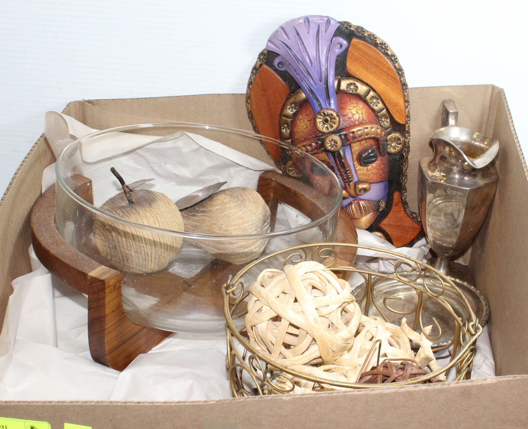 DECOR INCL. LARGE VINTAGE GLASS BOWL WITH WOOD STAND AND WOOD FRUIT, CLAY HAND PAINTED WALL MASK, METAL BASKET WITH WICKER BALLS, VINTAGE SILVER PLATED PITCHER & PLATE, ETC.