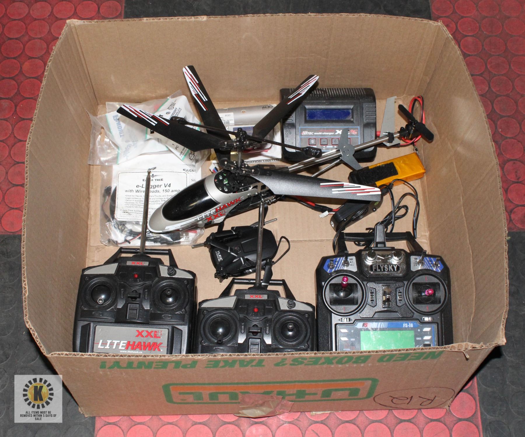 TWO LITE HAWK REMOTE CONTROLS, FLY SKY REMOTE CONTROLLER - VARIOUS NEW EXTRA PARTS - UNTESTED **ALL ITEMS MUST BE REMOVED BY 5PM SATURDAY, APRIL 3RD 2025. ALL REMAINING ITEMS WILL BE SUBJECT TO A $6.00 PER DAY STORAGE CHARGE. ANY ITEMS REMAINING AFTER MONDAY, MAY 19TH 2025 WILL BE CONSIDERED FORFEITED. NO REFUNDS WILL BE ISSUED FOR FORFEITED ITEMS. TO SCHEDULE A PICK UP APPOINTMENT CLICK HERE