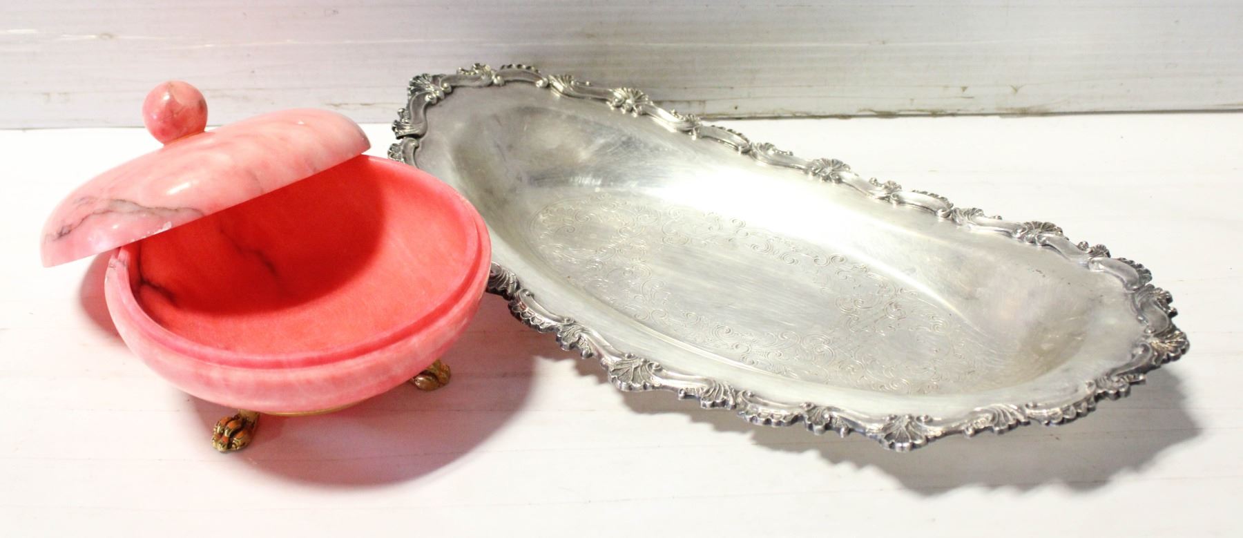 STONE LIDDED DISH 5 INCH DIAMETER SOLD WITH POLISHED OLD ENGLISH REPRODUCTION SILVER PLATED INTRICATE TRIMMED CURVED DISH 12 INCHES LONG 5.5 INCHES WIDE