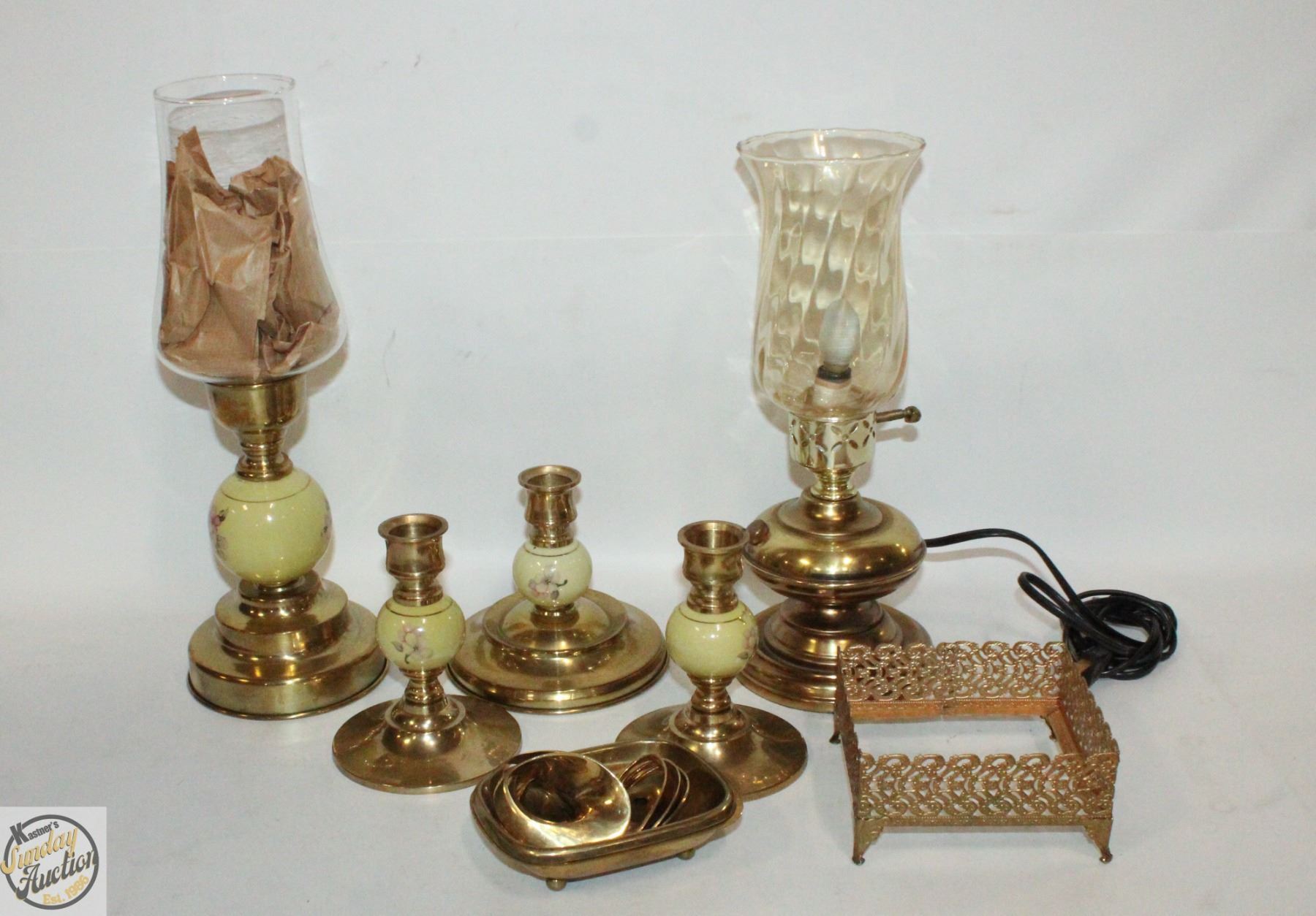 CANDLE HOLDERS WITH FLORAL ACCENTS + GLASS SHADE PLUG-IN LAMP BRASS BASED OIL LAMP THEMED **ALL ITEMS MUST BE REMOVED BY 5PM SATURDAY, AUGUST 9 2025. ALL REMAINING ITEMS WILL BE SUBJECT TO A $6.00 PER DAY STORAGE CHARGE. ANY ITEMS REMAINING AFTER MONDAY, AUGUST 25TH 2025 WILL BE CONSIDERED FORFEITED. NO REFUNDS WILL BE ISSUED FOR FORFEITED ITEMS. TO SCHEDULE A PICK UP APPOINTMENT CLICK HERE