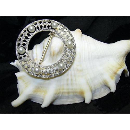 This is an estate round brooch with delicate cut outs decorated with small diamonds and with 6 small white pearls.