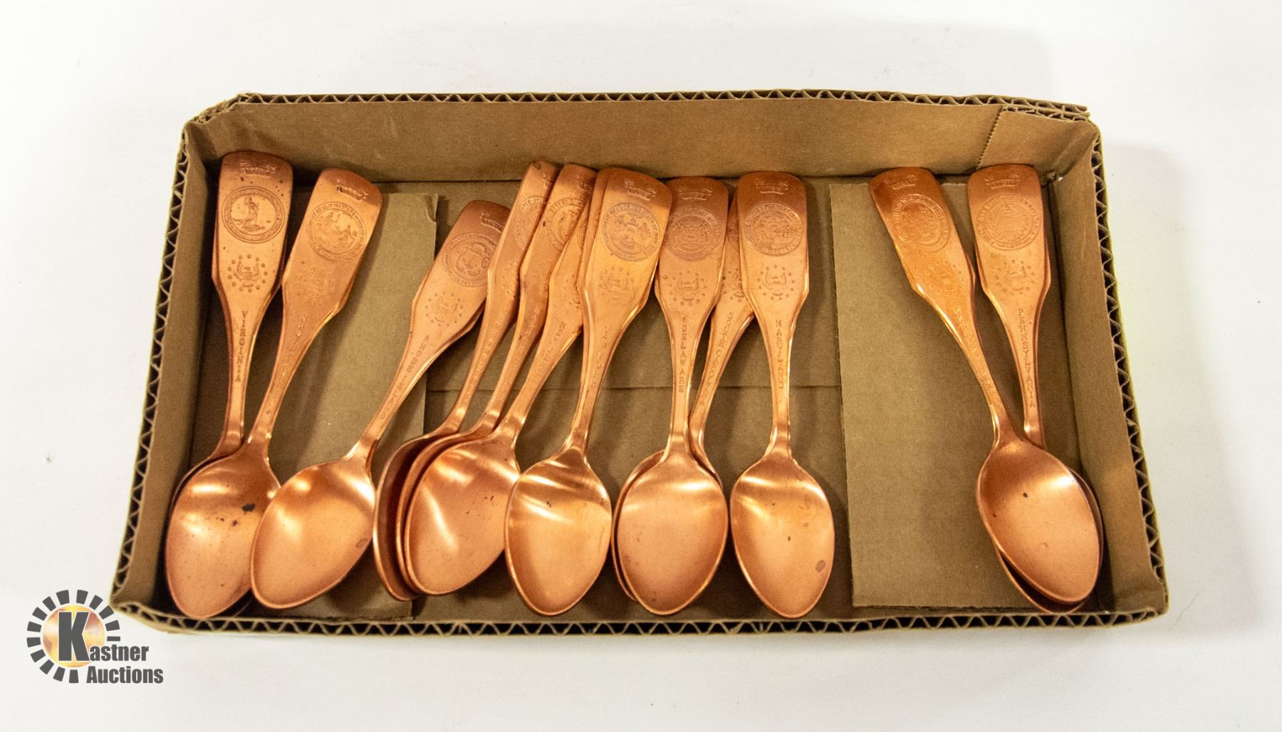 VINTAGE 13 ORIGINAL US COLONIES COMMEMORATIVE COPPER SPOON SET - COMPLETE SET OF 13