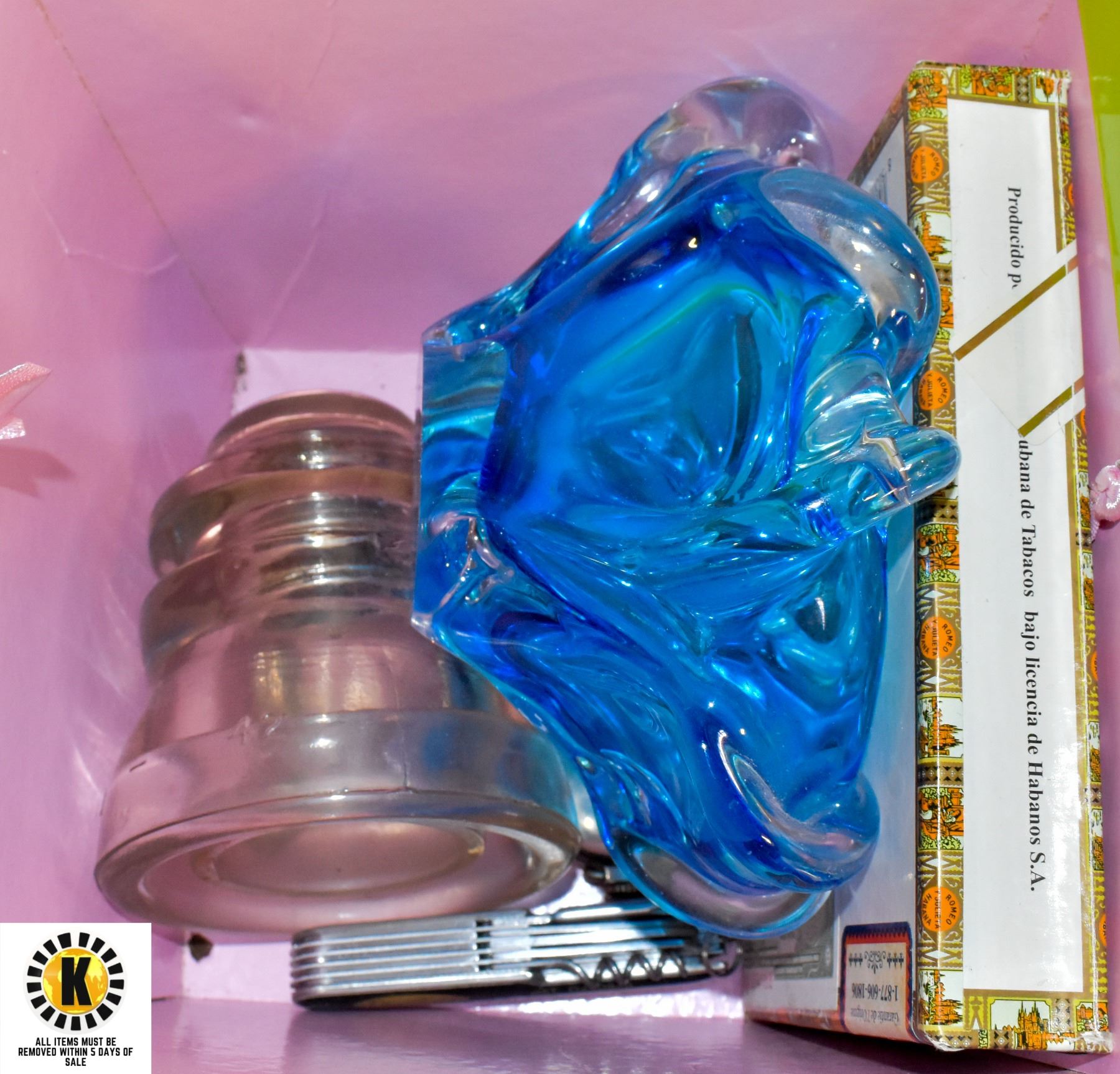 BLOWN GLASS HOLDER, POCKET WATCH & KNIFE
