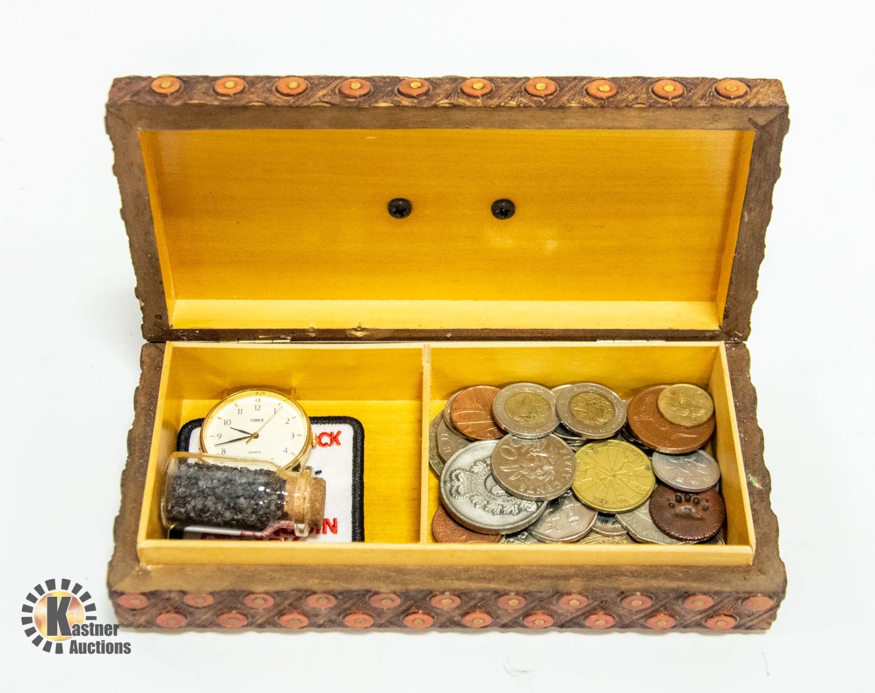 CAR TOP DISPLAY WITH WORLD COINS, SOME VINTAGE, WATCH, ETC. **ALL ITEMS MUST BE REMOVED BY 5PM SATURDAY, FEBRUARY 10TH 2024. ALL REMAINING ITEMS WILL BE SUBJECT TO A $6.00 PER DAY STORAGE CHARGE. ANY ITEMS REMAINING AFTER MONDAY, FEBRUARY 26TH, 2023 WILL BE CONSIDERED FORFEITED. NO REFUNDS WILL BE ISSUED FOR FORFEITED ITEMS. TO SCHEDULE A PICK UP APPOINTMENT CLICK HERE