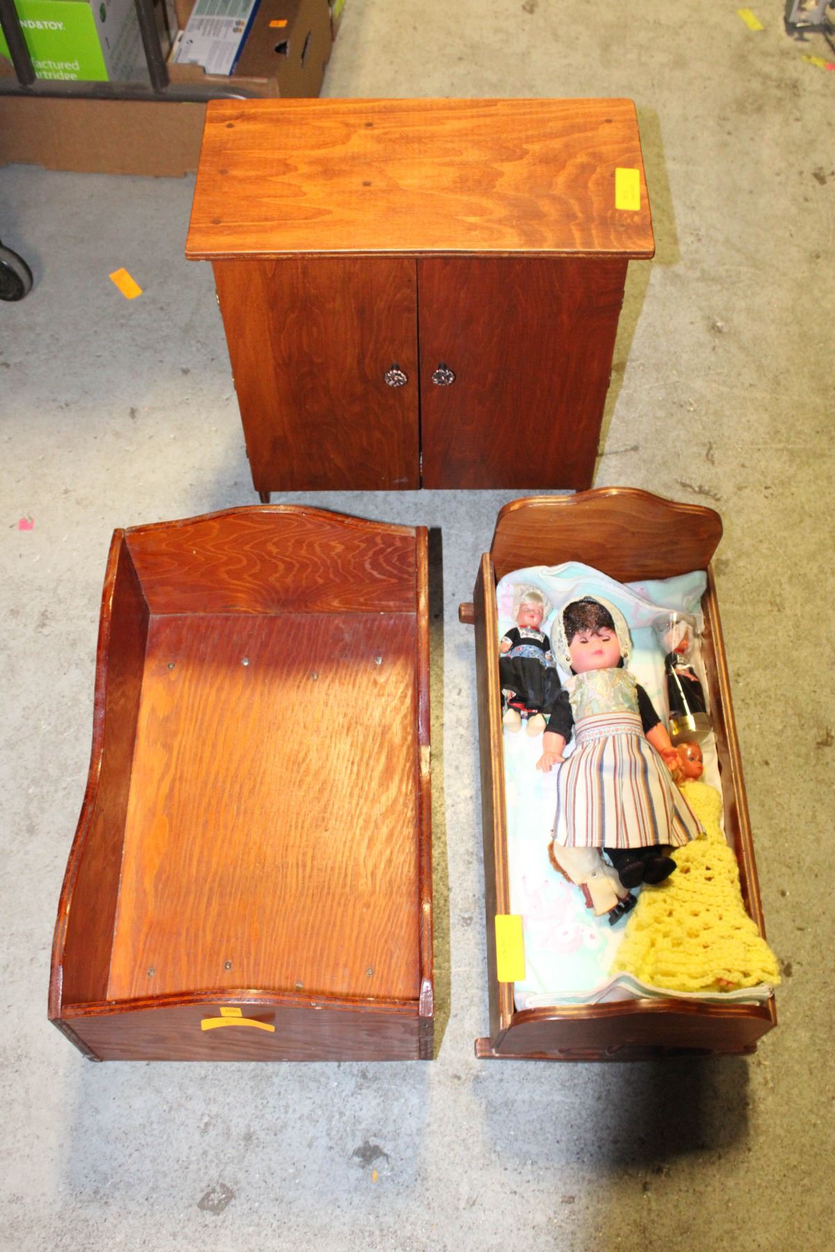 ESTATE DOLL CRADLE, CABINET AND BED, ALONG