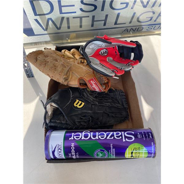 Ball gloves and 2  tennis balls233 - Ball gloves and 2 tennis balls