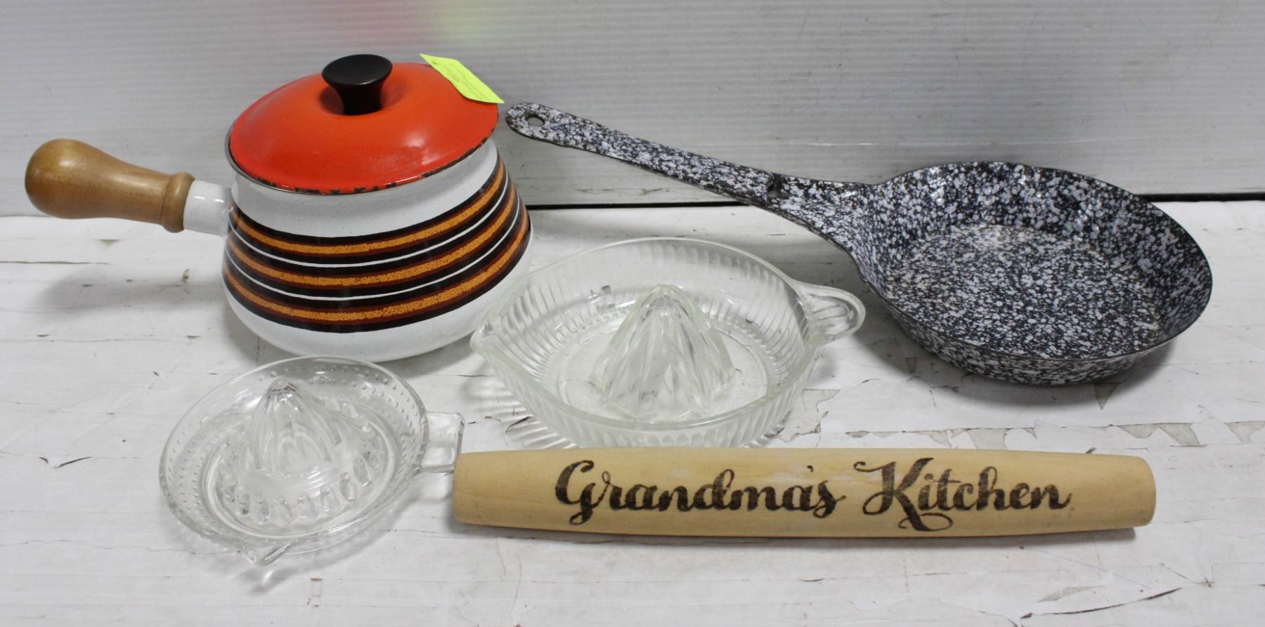 ESTATE ENAMEL PANS, PYREX JUICERS, GRANDMAS