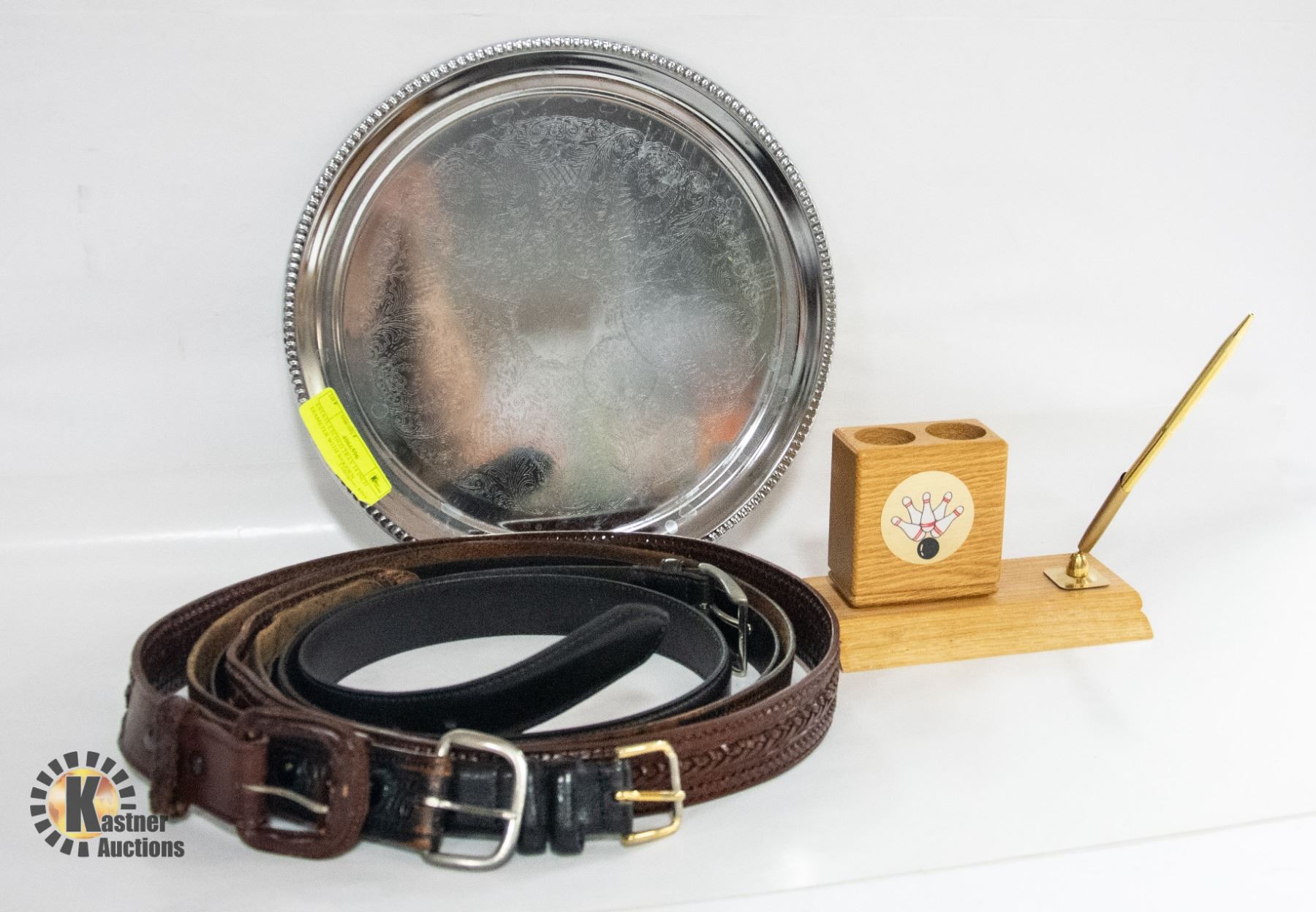 BOWLING THEMED PEN HOLDER + LEATHER HAND TOOLED BELTS ALL TOGETHER **ALL ITEMS MUST BE REMOVED BY 5PM SATURDAY, JANUARY 18TH 2025. ALL REMAINING ITEMS WILL BE SUBJECT TO A $6.00 PER DAY STORAGE CHARGE. ANY ITEMS REMAINING AFTER MONDAY, FEBRUARY 10TH 2025 WILL BE CONSIDERED FORFEITED. NO REFUNDS WILL BE ISSUED FOR FORFEITED ITEMS. TO SCHEDULE A PICK UP APPOINTMENT CLICK HERE