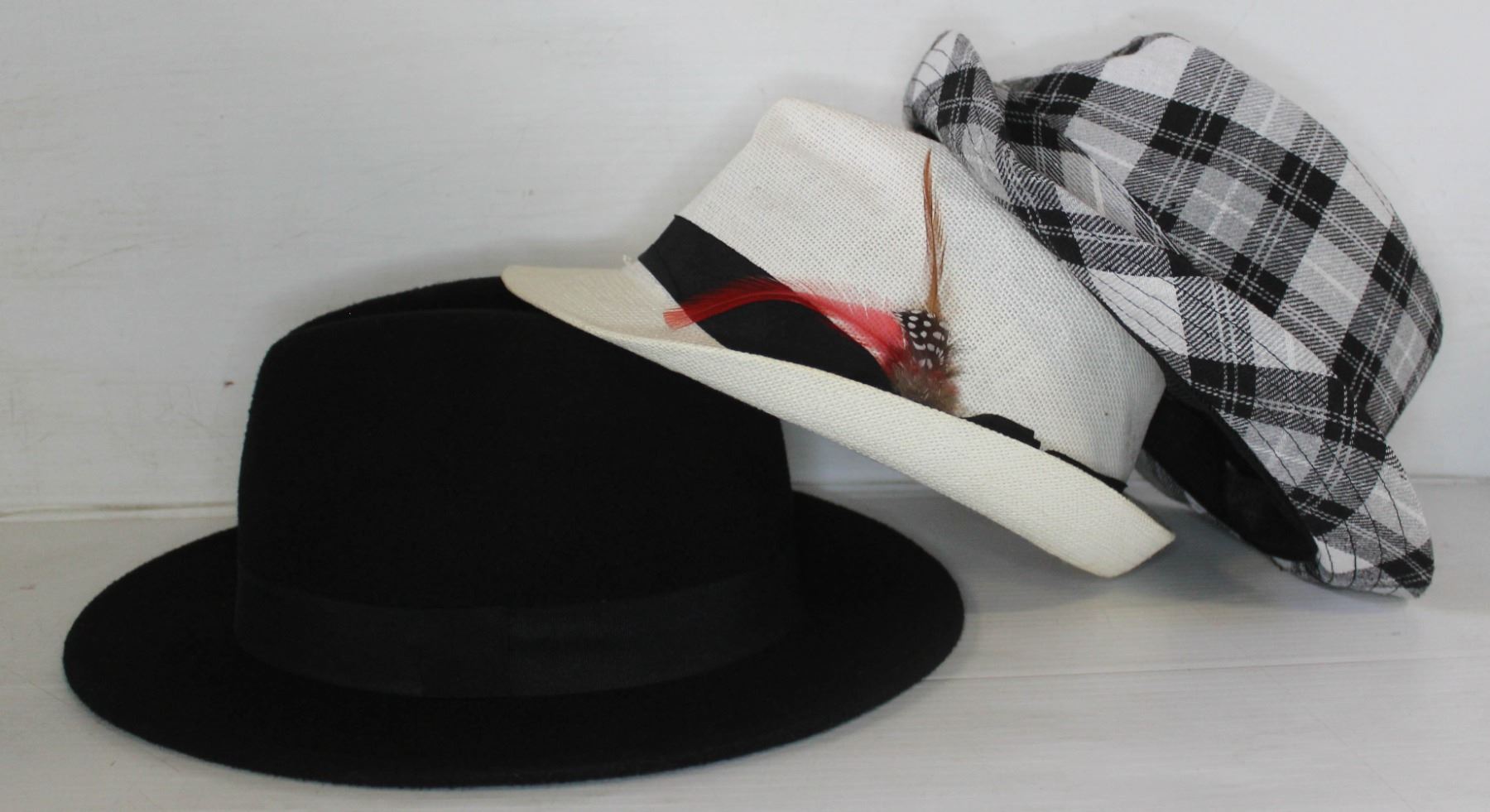 BLACK FELT PILGRIM COWBOY HAT SIZE 58M, SINATRA-STYLE HAT WITH FEATHERS, GUINNESS BLACK AND GREY PLAID HAT ONE-SIZE FITS MOST