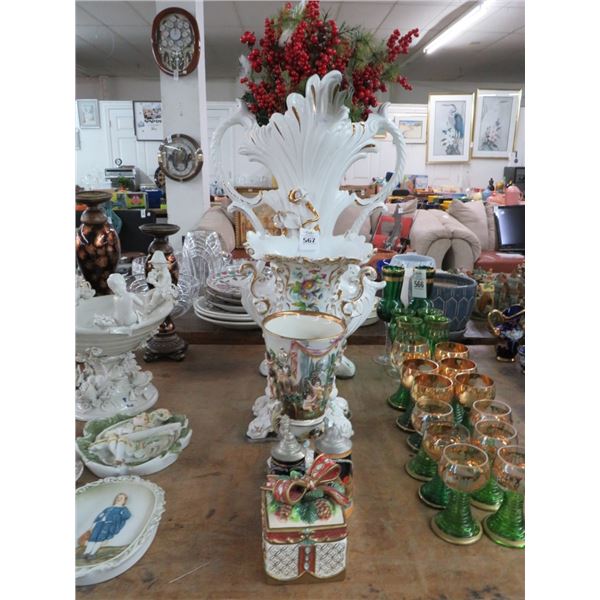 Capodimonte Style Large Ornate Vase and Lighted Urn, Steins, Keepsake Box