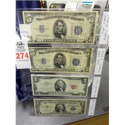 Sleeve of 1934A $5, 1934D $5, 1963 Red Seal $2, 1957 $1 Star Note