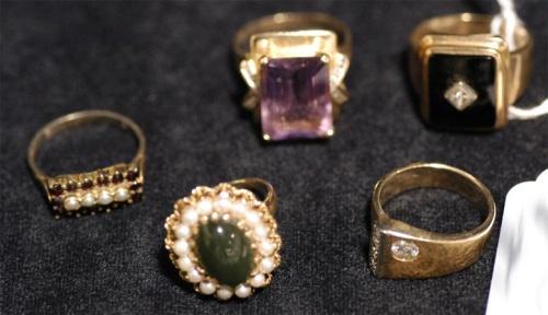ESTATE GROUP OF 5 GOLD RINGS including diamond, amethyst, garnet, jade and onyx <BR>condition: excellent