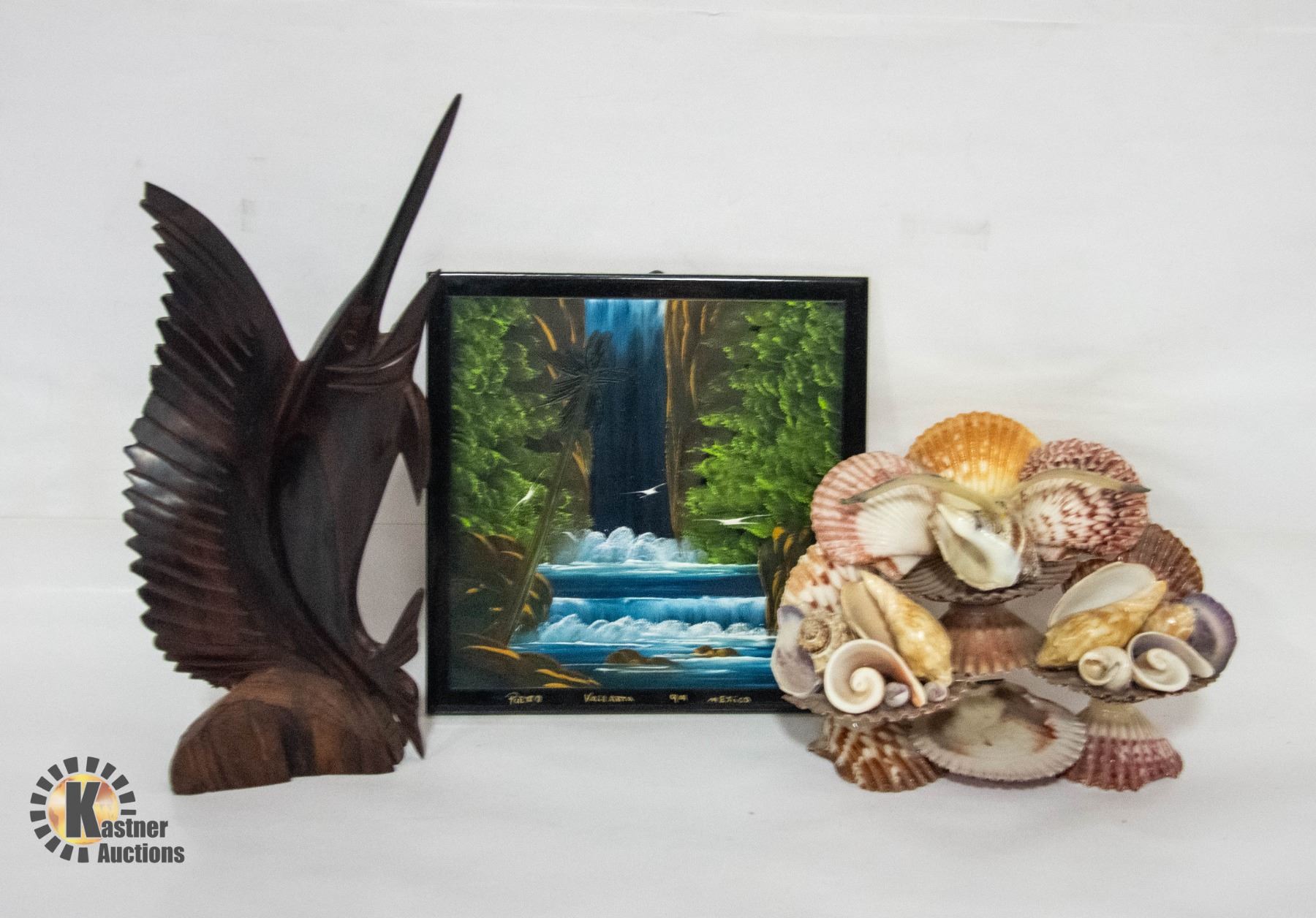 HANDCARVED WOODEN SWORDFISH 10 INCHES TALL + HANDPAINTED WATERFALL SCENE ON A CERAMIC TILE **ALL ITEMS MUST BE REMOVED BY 5PM SATURDAY, JANUARY 18TH 2025. ALL REMAINING ITEMS WILL BE SUBJECT TO A $6.00 PER DAY STORAGE CHARGE. ANY ITEMS REMAINING AFTER MONDAY, FEBRUARY 10TH 2025 WILL BE CONSIDERED FORFEITED. NO REFUNDS WILL BE ISSUED FOR FORFEITED ITEMS. TO SCHEDULE A PICK UP APPOINTMENT CLICK HERE