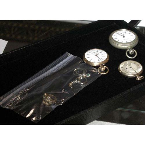 ESTATE JEWELRY AND WATCH TRAY LOT including approx .30 ct diamond solitaire ring, diamond earrings and 3 pocket watches, CONDITION: one watch missing lid, watches not running, PACKING AND SHIPPING: Fairfield Auction will provide packing and shipping (excluding insurance) within the Continental U.S. for $20. Buyer is welcome to use any other service or pick-up at the gallery.