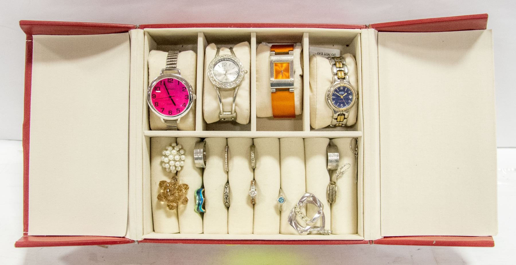 ESTATE JEWELRY BOX OF WATCHES & RINGS