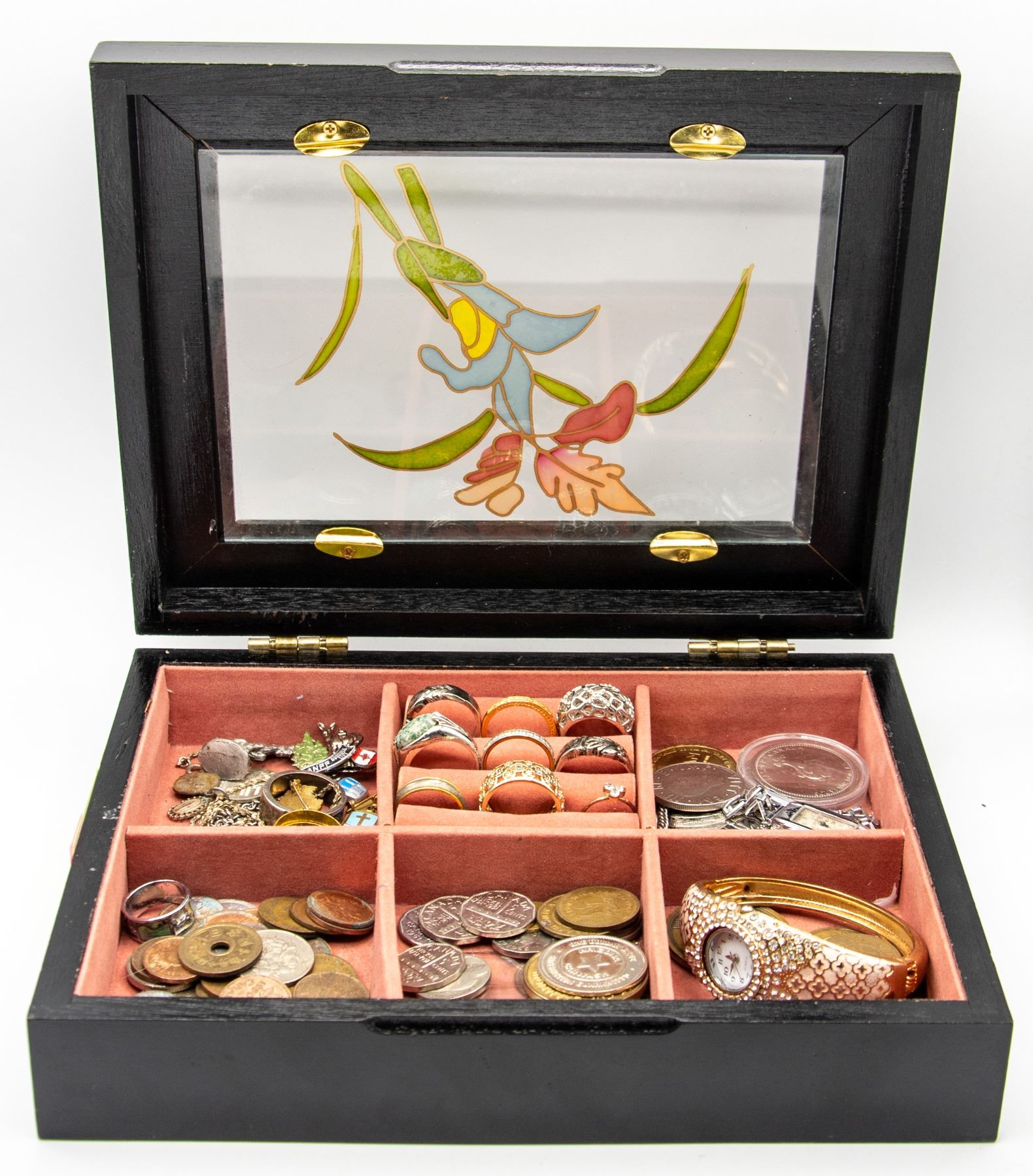 ESTATE KEEPSAKE BOX OF COINS AND JEWELRY