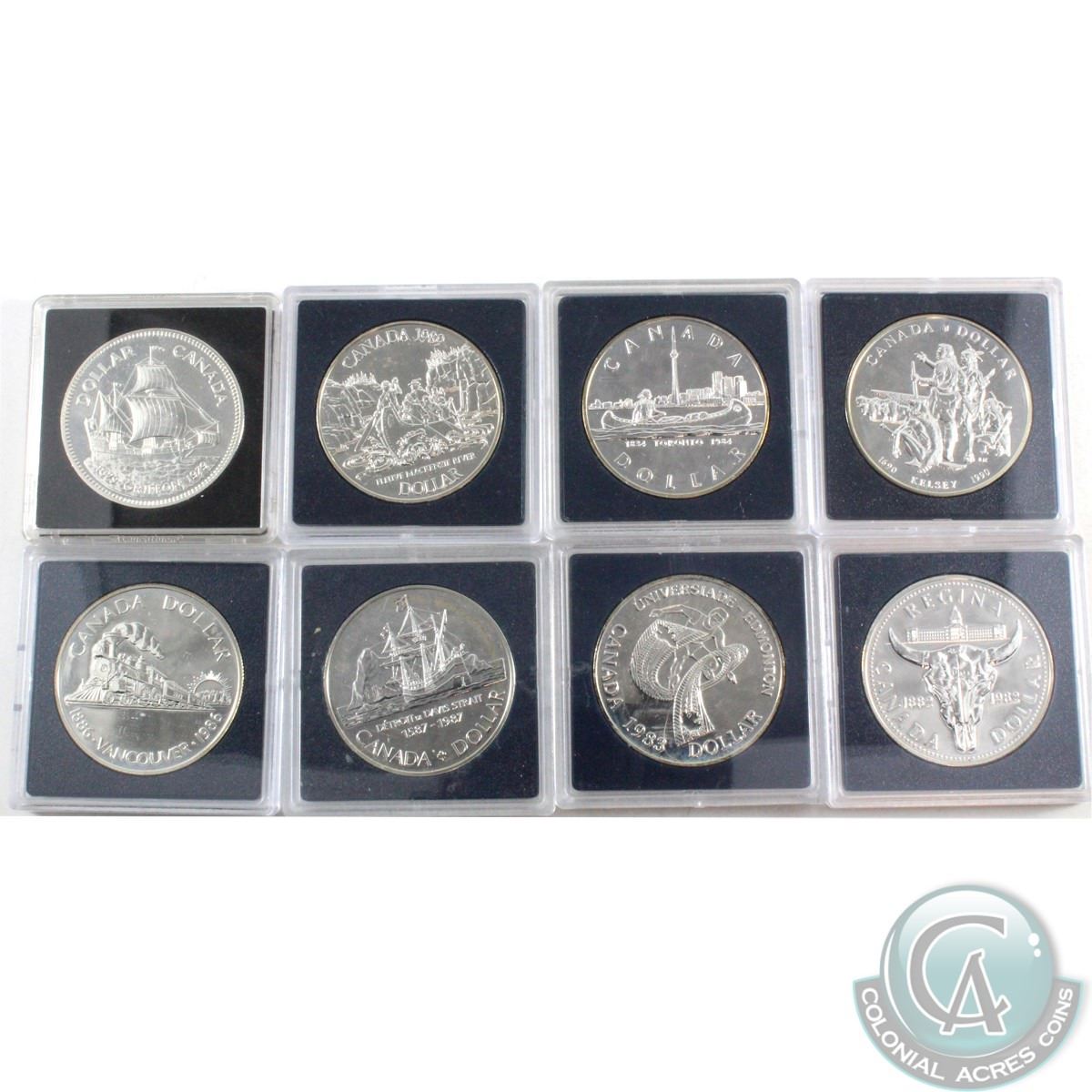 ESTATE Lot: 1979-1990 Canada Commemorative Brilliant Uncirculated Silver Dollars Issued by the RCM. You will receive the years 1979, 1982, 1983, 1984, 1986, 1987, 1989 and 1990. The coins are toned and most capsules are scratched. (8pcs)