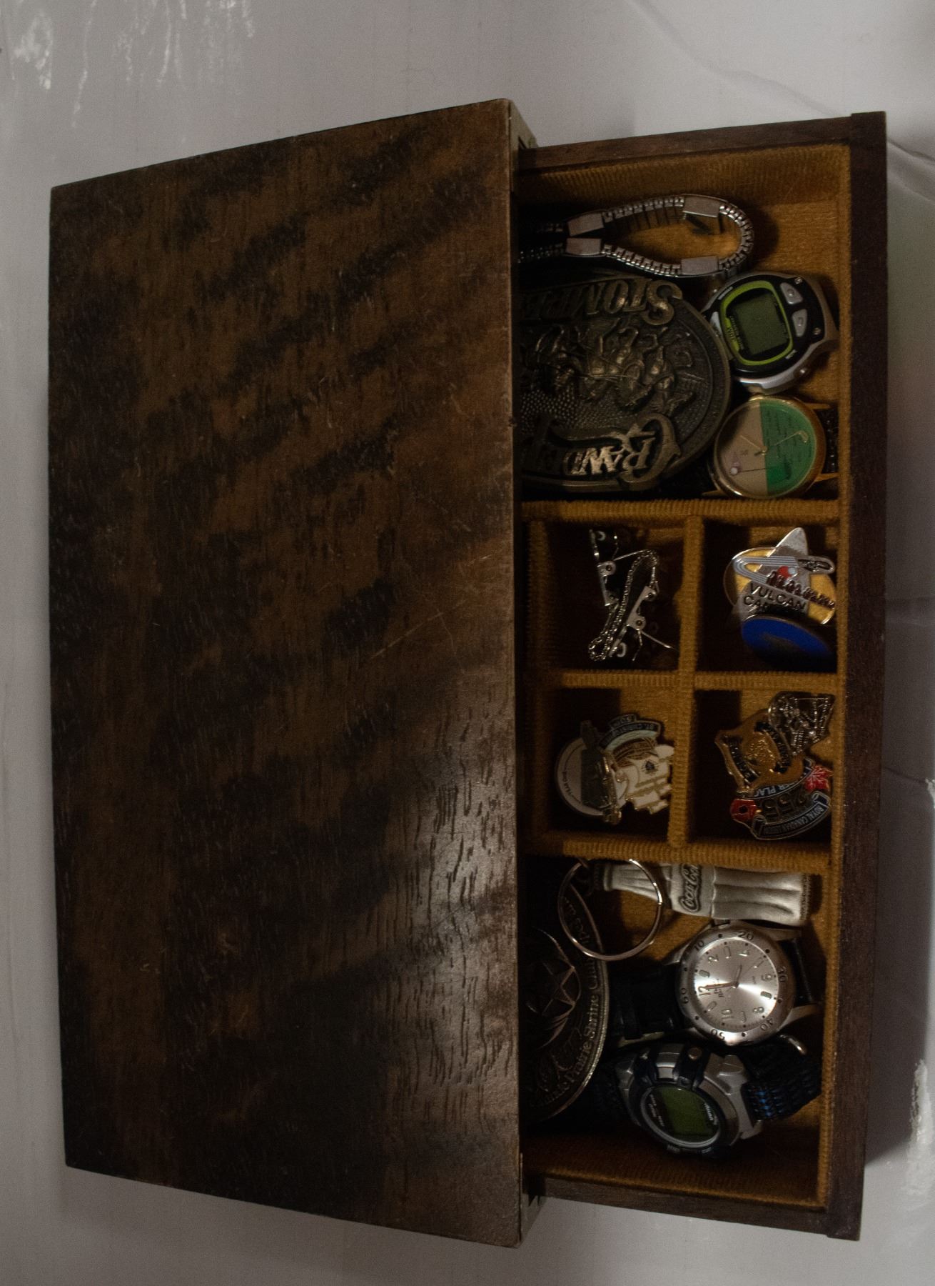 ESTATE MENS WOOD JEWELRY BOX WITH BUCKLES,