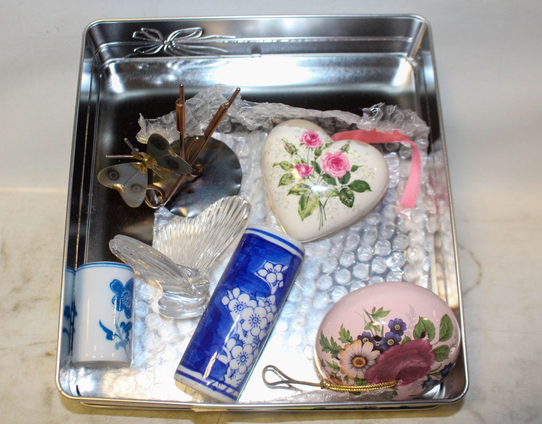 2 ORIENTAL CERAMIC VASES BLUE WHITE + 2 BUTTERFLY ART PIECES GLASS BUTTERFLY + WELDED/SOLDERED BUTTERFLY DESKTOP DECOR PC