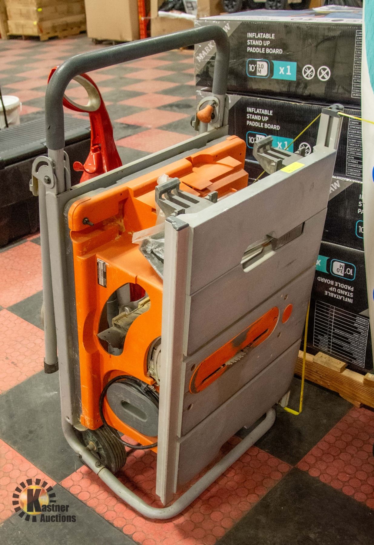 2-WHEEL FOLD-AWAY WORK STAND, SAW APPEARS TO HAVE ELECTRICAL ISSUE AT BOX (UNTESTED) **ALL ITEMS MUST BE REMOVED BY 5PM SATURDAY, FEBRUARY 17TH 2024. ALL REMAINING ITEMS WILL BE SUBJECT TO A $6.00 PER DAY STORAGE CHARGE. ANY ITEMS REMAINING AFTER MONDAY, MARCH 4TH, 2023 WILL BE CONSIDERED FORFEITED. NO REFUNDS WILL BE ISSUED FOR FORFEITED ITEMS. TO SCHEDULE A PICK UP APPOINTMENT CLICK HERE